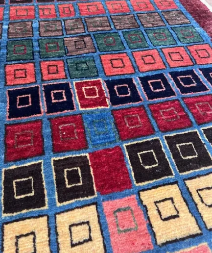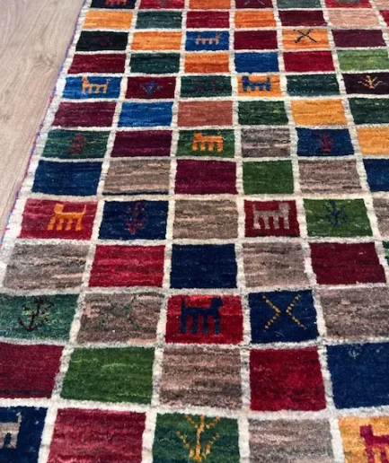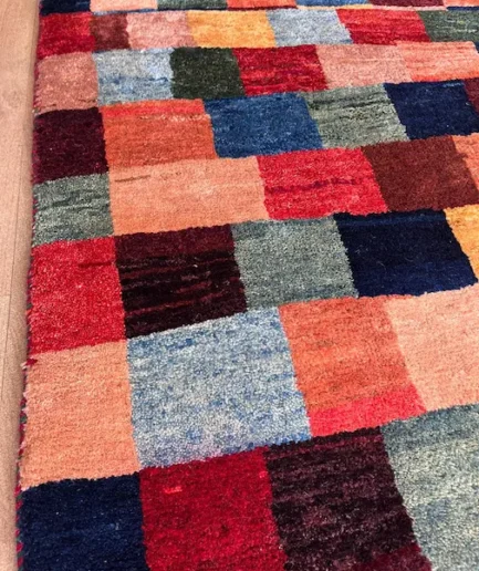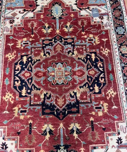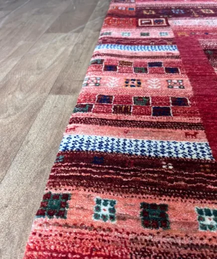 • Red patterned rug on wooden floorOrnate red and patterned rug