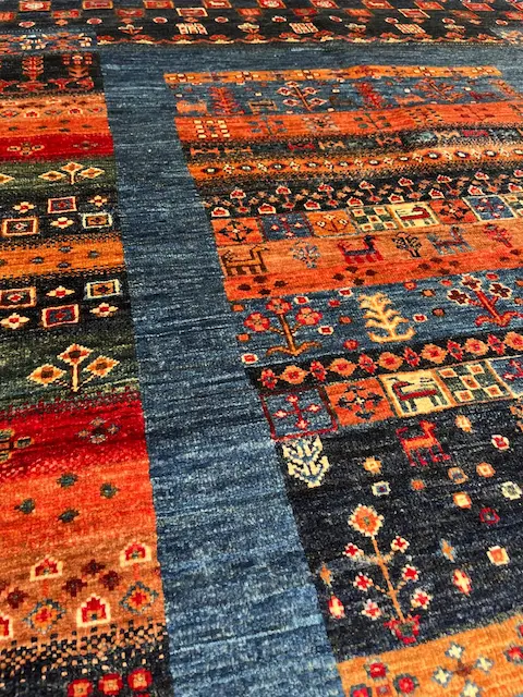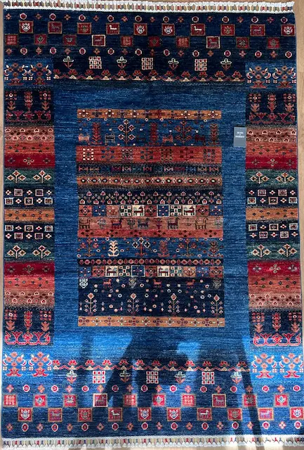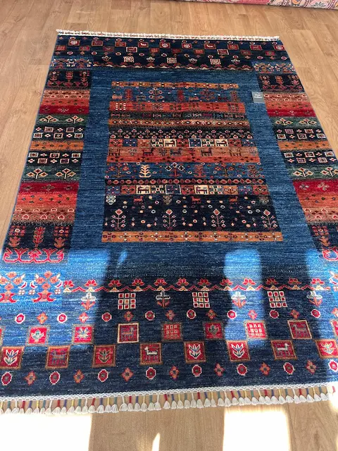 A beautiful hand-woven Afghan rug. These pieces are inspired by old Persian nomadic camel bags. Using vibrant colours and the best hand-spun wool to give a rich and silky look.
