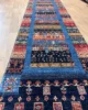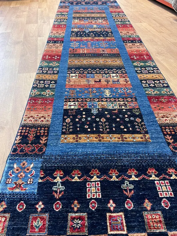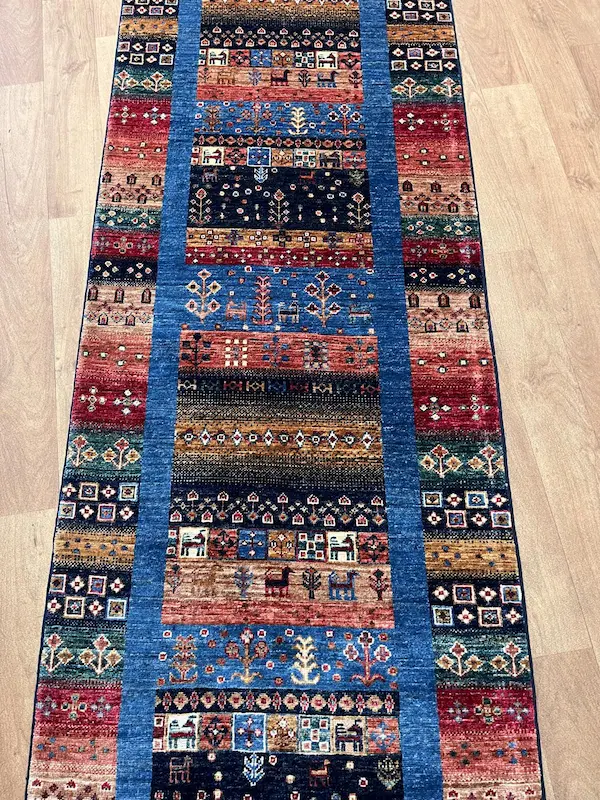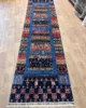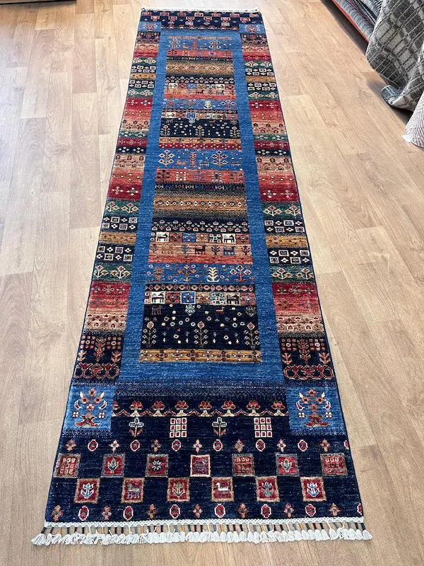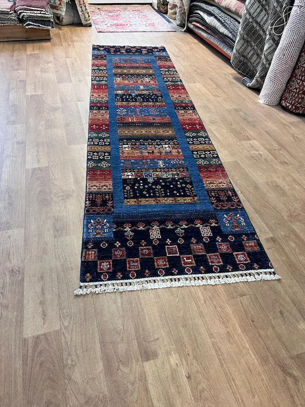 A beautiful runner hand-woven in Afghanistan. These pieces are inspired by old Persian nomadic camel bags. Using vibrant colours and the best hand-spun wool to give a rich and silky look. These runners add brightness and character to any hallway.