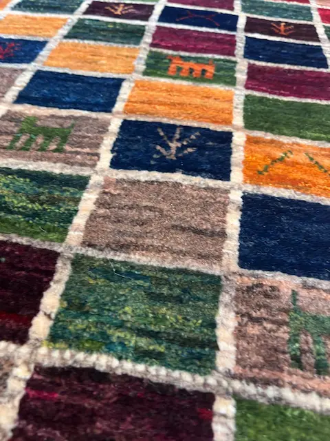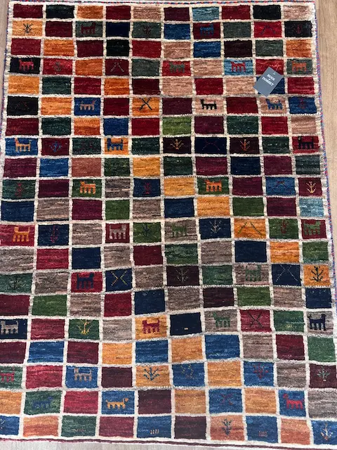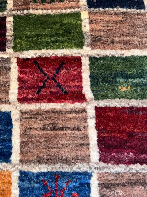 The Luri and Qashqa’i nomads who migrate over vast territories in Southern and Western Iran have long been famous for their carpets, made from the wool of their own sheep which they have carded and spun themselves. They are woven by the women of the tribes, on primitive portable looms which are stretched out on the ground. Apart from the fine more formal carpets for which the tribes are famous, they also weave another type of rug which are much more creative in design. These are the Gabbehs.