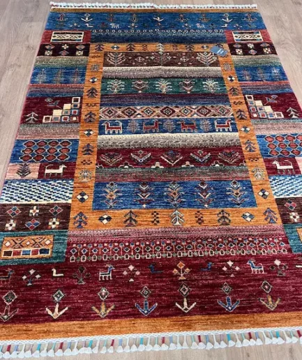 The Luri and Qashqa’i nomads who migrate over vast territories in Southern and Western Iran have long been famous for their carpets, made from the wool of their own sheep which they have carded and spun themselves. They are woven by the women of the tribes, on primitive portable looms which are stretched out on the ground. Apart from the fine more formal carpets for which the tribes are famous, they also weave another type of rug which are much more creative in design. These are the Gabbehs. This particular piece mixes the checker board design with a plain open field using undyed wool. Giving a totally unique rug