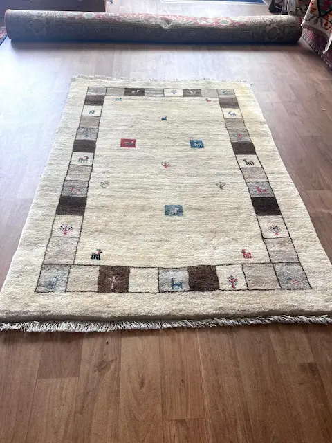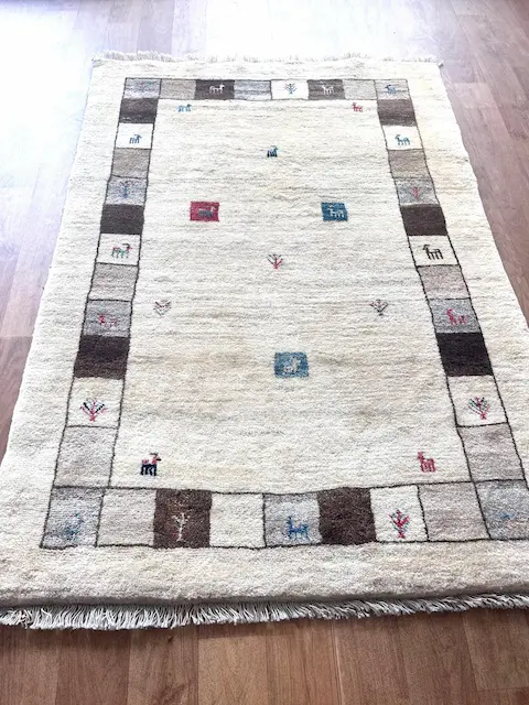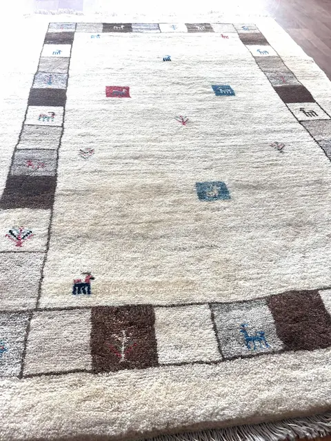 The Luri and Qashqa’i nomads who migrate over vast territories in Southern and Western Iran have long been famous for their carpets, made from the wool of their own sheep which they have carded and spun themselves. They are woven by the women of the tribes, on primitive portable looms which are stretched out on the ground. Apart from the fine more formal carpets for which the tribes are famous, they also weave another type of rug which are much more creative in design. These are the Gabbehs. This piece using mainly undyed wool is joy for its simplicity and incredible lustrous feel.
