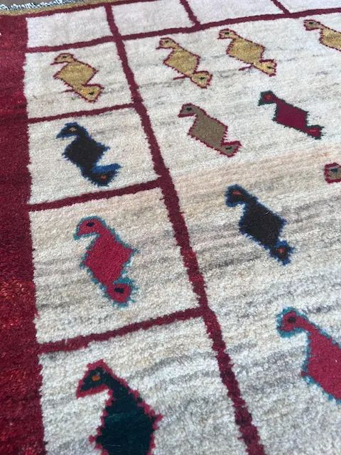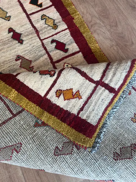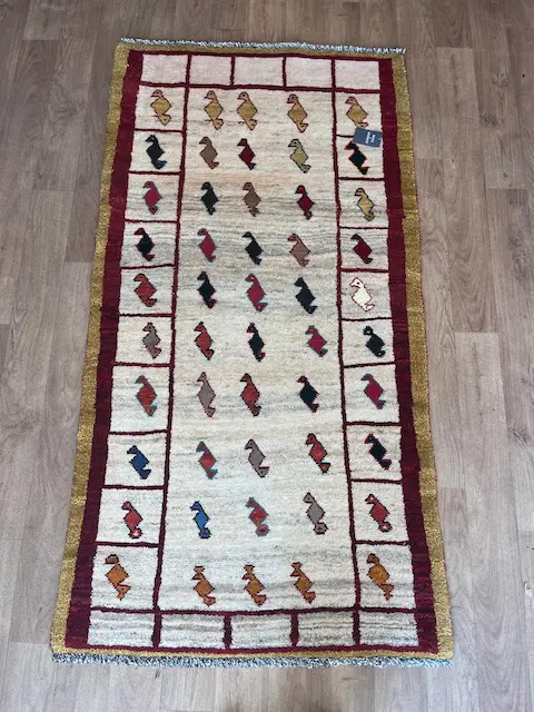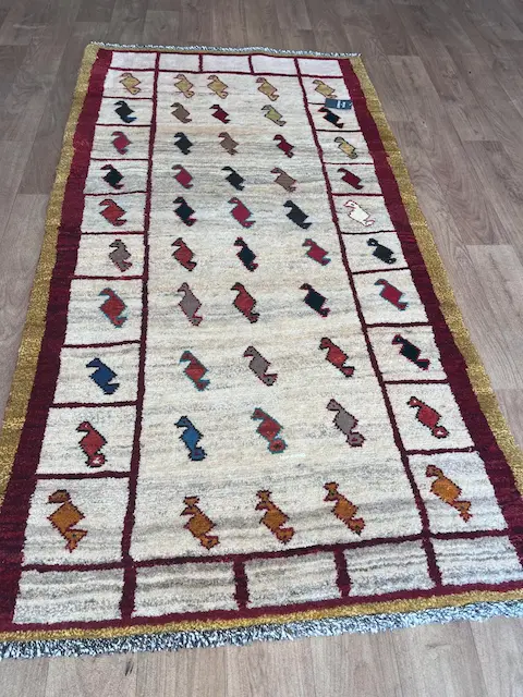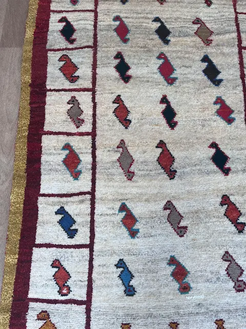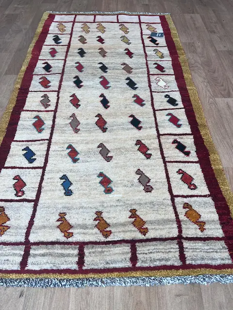 The Luri and Qashqa’i nomads who migrate over vast territories in Southern and Western Iran have long been famous for their carpets, made from the wool of their own sheep which they have carded and spun themselves. They are woven by the women of the tribes, on primitive portable looms which are stretched out on the ground. Apart from the fine more formal carpets for which the tribes are famous, they also weave another type of rug which are much more creative in design. These are the Gabbehs. Nowadays, to distinguish them from the new production of gabbehs woven in villages around Shiraz (and which are also excellent rugs) we tend to call the proper tent-woven pieces Old Gabbehs or Traditional Gabbehs