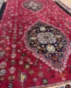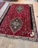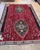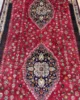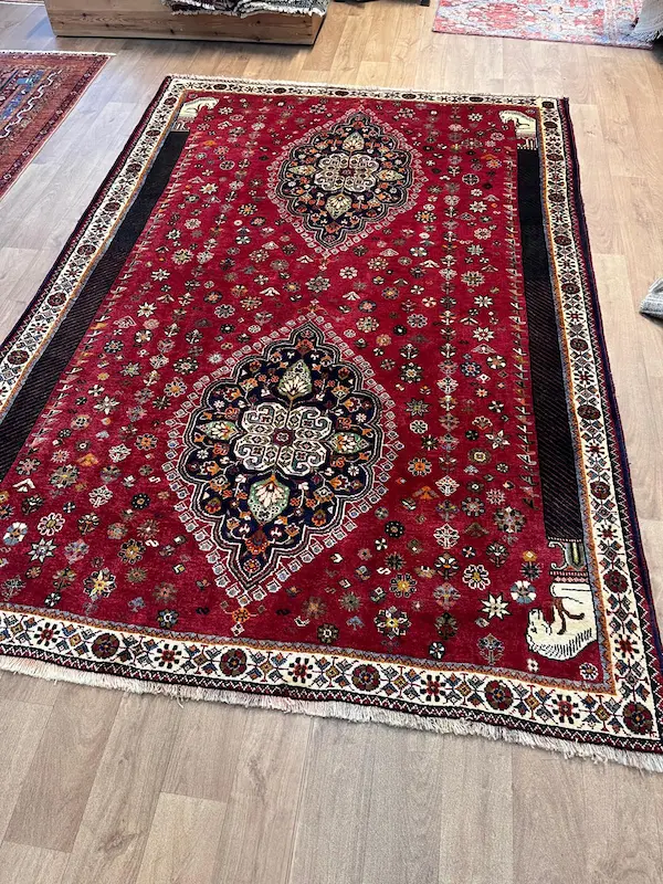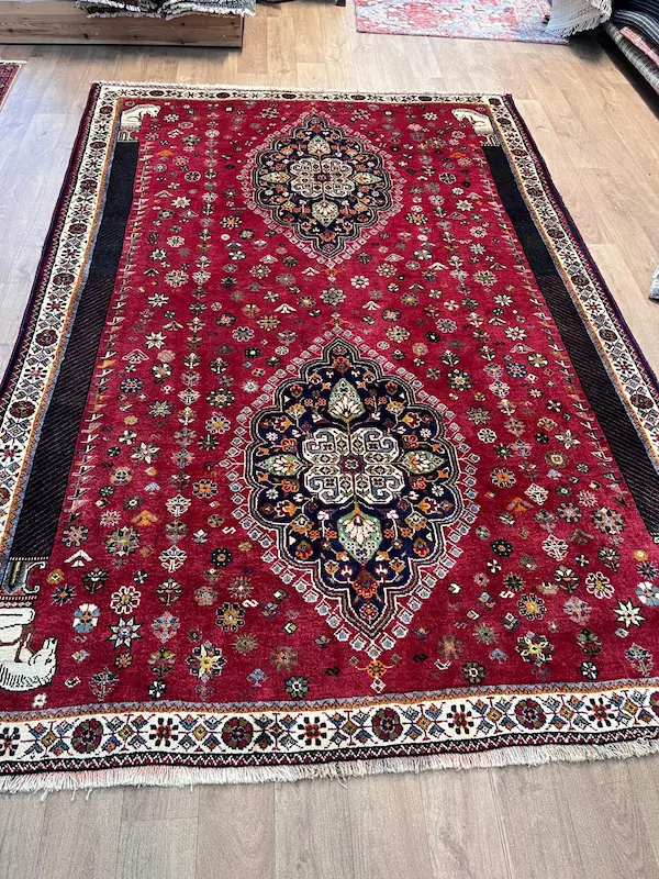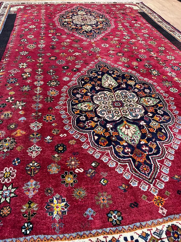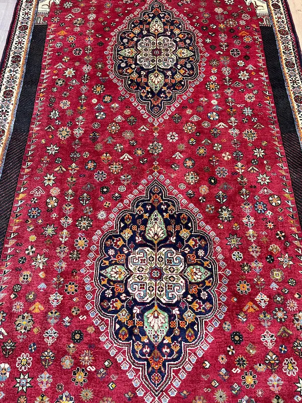 The Qashqa’i are famous for their skill as carpet weavers. Weaving traditionally takes place in the summer pastures when the evenings are longer. It is undertaken exclusively by women. The rugs are made entirely of wool, the Qashqa’i being nomadic they have no access to cotton or other fabrics. There is no division of labour and the rugs ae generally woven from the family’s own sheep, shorn, sorted, carded and spun by the family which creates the rug and which will ultimately use it. There is extensive use of natural dyes though the Qashqa’i love bright colours and will often introduce tiny highlights of synthetically dyed wool to brighten up the designs. The traditional background colour is red, and most of the rugs have an odd number of central medallions; one, three or sometimes five. All-over designs are rarer. A particular rare piece as this has two medallions and woven finely but with a relatively thick pile