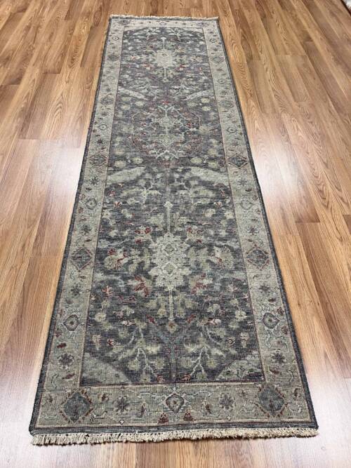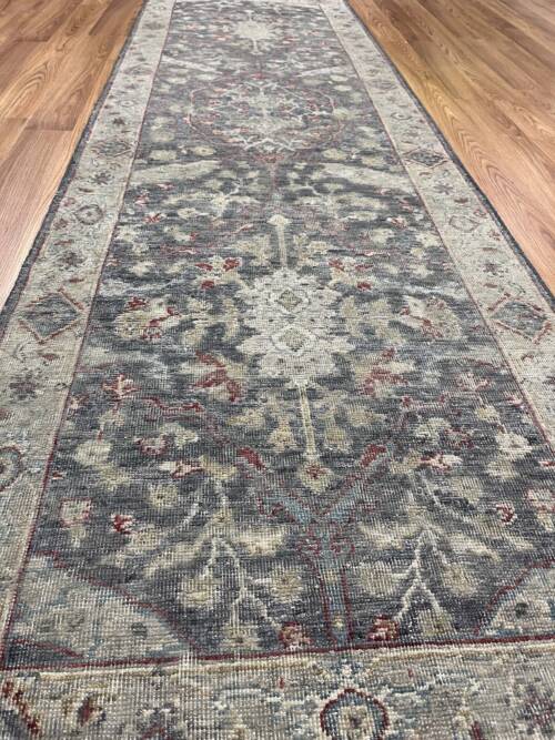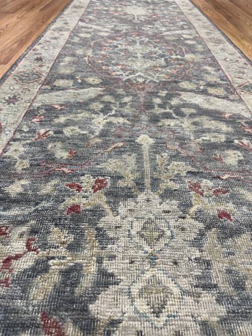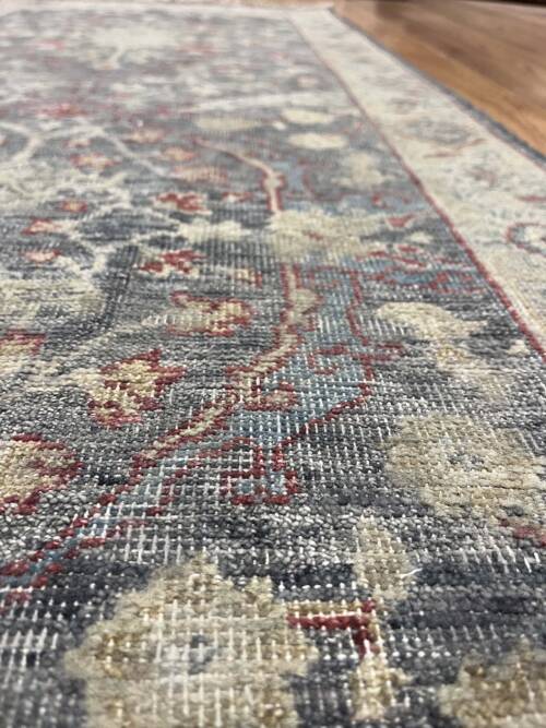 A brand new runner looking 100 years old. Great soft colours in this hand-made Bhadohi rug