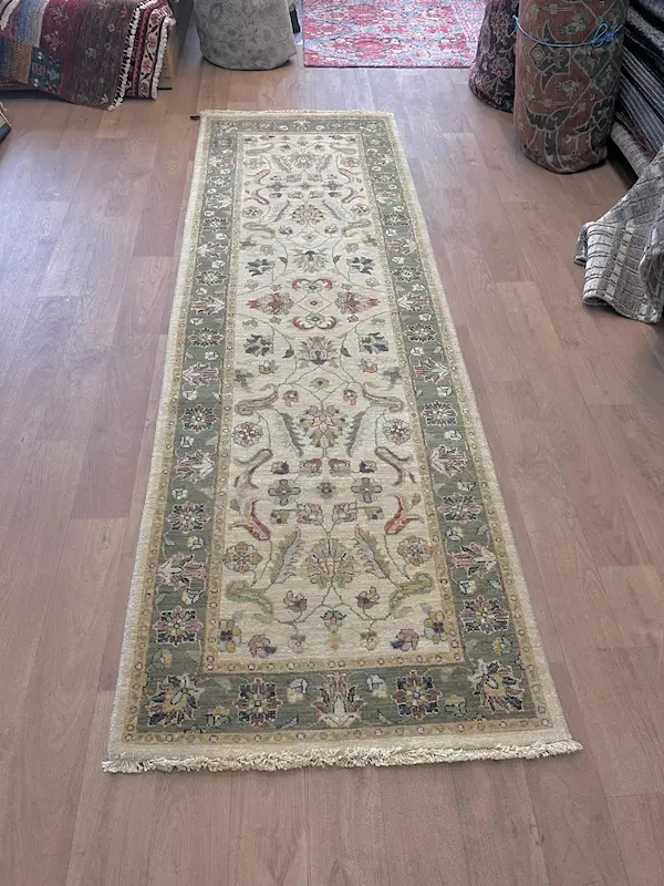 Ziegler rugs are copies of Old Mahal rugs designed by an anglo/swiss company in the late 19th century. This one is woven in India with a mixture of local wool and NZ wool. With a stunning crisp clean cream centre, offset by a soft green border